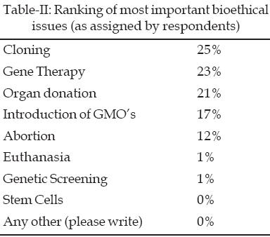 7 Ignoring the above comment, 6% of students suggested that state laws should be the ideal basis for Bioethical discussion and 83.9% of the students responded that religion was very important in their lives hence it forms an ideal basis for bioethical discussions. In other words a vast majority of respondents would prefer to settle ethical questions in accordance with teachings of Islam. The role of religion in the Islamic Republic of Pakistan has been emphasized in the literature.8-10From the responses regarding the role of religion in people lives and in settling Bioethical issues, it can be concluded that the government should consult Ulema and Islamic Scholars while framing any laws or regulations. The respondents differed in their opinion regarding "the most important Bio-ethical issue" Ethical issues regarded as "the most important" are listed below (Table-II).