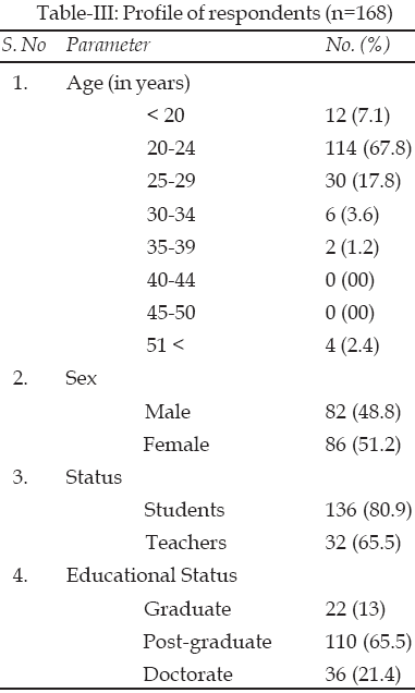 A questionnaire consisting of 29 questions was distributed among 200 students and faculty members of the above mentioned departments. One hundred and sixty eight (168) responses were received. The questionnaire was administered by the authors and some trained students. Computer softwares SPSS and Microsoft Excel were used to analyze the data. This manuscript reports the results of only one set of questions (Table-I).