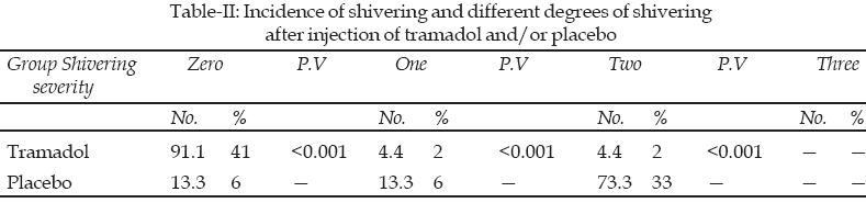 Four patients (8.8%) from study group and 39 patients (86.6%) from control group experienced shivering, thus there were significant difference between the two groups (P<0.001). 4.4% of parturients experienced mild shivering and 4.4% had moderate shivering in study group whereas 13.3% had mild shivering and 73.3% had moderate shivering in control group. Therefore from the point of shivering severity there was a significant difference (P<0.001). Severe shivering was not noticed in both the groups (Table-II).