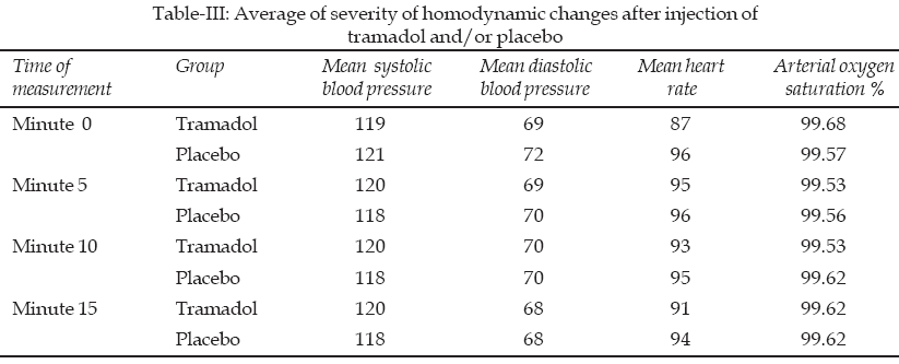 Methodology: In this randomized double blind cross-sectional study, 90 patients who were candidates for cesarean section with American Society of Anesthesiologist (ASA) I or II, from April 2005 until February 2006 were randomly allocated to one of two groups (study and control). All patients underwent spinal anesthesia. Near the end of operation, 1mg/kg tramadol in 20ml (diluted by normal saline) to study group and 20ml of normal saline to control group was slowly injected intravenously. Patients were evaluated regarding their hemodynamic signs, arterial oxygen saturation percentage, oral temperature, presence and intensity of shivering and nausea and vomiting. Collected data was analysed by using of Chi-square test.
