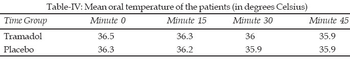 As regards arterial oxygen saturation percentage, there was no significant statistical difference in both groups. Meaningful statistical differences as regards mean oral temperature did not exist between the two groups either (Table-IV). Since 30% of patients experienced nausea and vomiting in both groups, hence there was no significant difference.