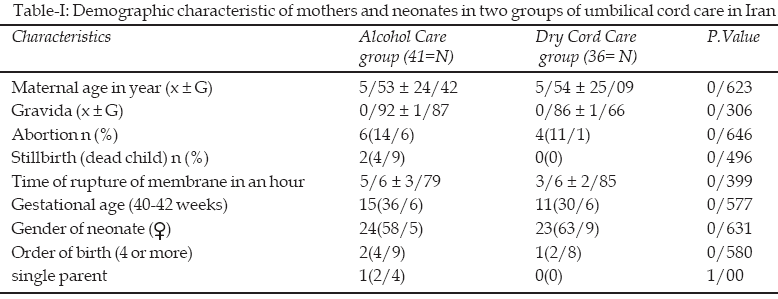 A total of 84 newborn infants were included in the study. Seven of them were excluded due to incomplete follow up or concurrent use of two methods for cord care. The main demographic characteristics of the subjects are shown in Table-I. Study groups were similar with respect to their mean maternal age (p=0.623), parental status (p=1.00) gravidity (p=0.306), gestational age (p=0.577), birth weight (p=0.06) and gender (p=0.631).