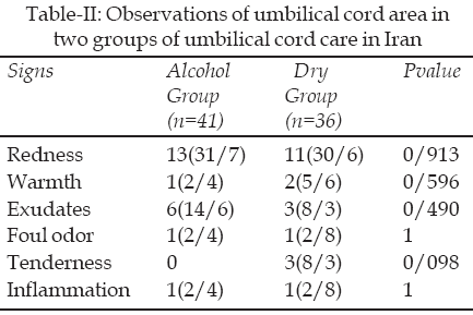 The results of the umbilical cord observation of the two cord care methods are presented in Table-II. There was no significant difference in the prevalence of the umbilical cord signs in all three times observation of the two umbilical cord care groups. Sepsis or death was not observed in any of the cases.