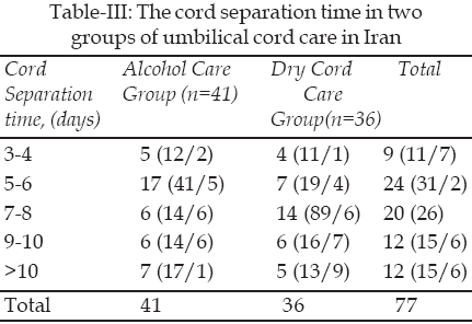 The mean time of cord separation in alcohol and dry cord care groups were 7.39 and 7.6 days after birth, respectively. No significant difference was observed in the mean cord separation time among the two groups (p=0.688). Table-III shows data regarding the cord separation time in two group of the study.