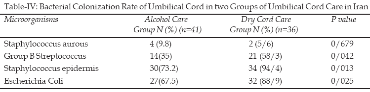 The umbilical cord colonization findings are shown in Table-IV. The group B Streptococcus contamination was significantly lower in newborns treated with alcohol (p=0.042). The umbilical cord contamination by Staphylococcus epidermis significantly decreased in alcohol group (p=0.02). The Escherichia coli contamination was significantly higher in dry cord care group (p= 0.025). While the rate of growth Staphylococcus aureus was higher in alcohol group, no significant difference was detected between two groups of the study.