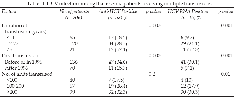 Two hundred six thalassemia patients were tested. There were 97 (47.1%) males and 109 (52.9%) females (Table-I); their mean age (±SD) was 16.4±6.42 years (range 2-34 years). Fifty eight of the 206 patients were anti-HCV positive by ELISA corresponding to a 28.1% (58/206, 95% CI: 22.4-34.6). The mean age of the fifty eight anti-HCV positive patients was higher than that of negative patients (18.98±6.65 vs. 15.47±6.06, p<0.001). No significant statistical difference in anti-HCV seropositivity was observed between males and females (p=1.0). The prevalence of anti-HCV seropositivity (47/136, 34.6%) was significantly higher (p<0.003) among patients who had started to receive transfusions before 1996 when serological screening for anti-HCV antibody had been in introduced to blood banks in Iran, than among patients (11/70, 15.7%) who had started to receive transfusions after 1996 (Table-II). The results indicate the incidence of anti-HCV was significantly associated with longer duration of transfusion (p<0.003).