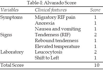 11. Khan I, Rehman A. Application of Alvarado scoring system in diagnosis of acute appendicitis. J Ayub Med Coll Abottabad 2005;17:41-4.