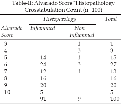 Study was conducted at ward-V Department of General Surgery, Pakistan Institute of Medical Sciences Islamabad from December 2006 to June 2007. One hundred patients were included in the study after taking informed consent. Patients with the diagnosis of acute appendicitis were admitted in the ward and their Alvarado score (Table-I) were calculated. A score of >7 was indicating acute appendicitis and a score below this level meant normal appendix but the decision to undergo surgery was purely on clinical grounds. Patients were operated by conventional method of appendicectomy. Diagnosis was confirmed by histopathology findings, which reveals in early acute appendicitis scant neutrophil exudation throughout the mucosa, submucosa and muscularis, Congestion of subserosal vessels, perivascular neutrophil emigration. The Alvarado score was correlated with the histopathological findings of the removed appendix (Table-II). All data was analysed by SPSS version 10.