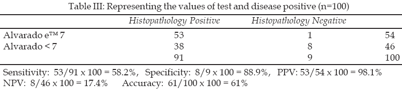 Methodology: Study was conducted in Surgical Ward 5, Pakistan Institute of Medical Sciences Islamabad. Duration of study was Six month from December 2006 to June 2007. Hundred consecutive patients which presented to our surgical team with acute appendicitis were assessed prospectively using Alvarado score. They were given specific scores according to the variable and divided into two groups, group one (score >7) group two (score <7). All patients were operated irrespective of score, if clinical diagnosis of acute appendicitis was made. Postoperatively, diagnosis was confirmed by histopathology report. Validity of scoring system was assessed by calculating sensitivity, specificity and positive predictive value.