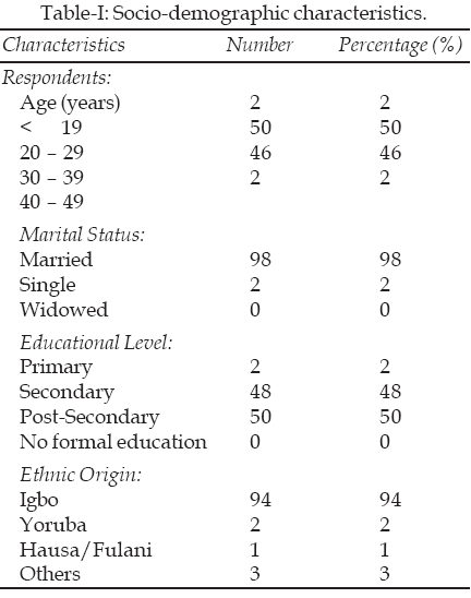 A total of one hundred consecutive antenatal clinic attendees were recruited for the study. Table-I shows the socio-demographic characteristics. Two participants were teenagers, fifty were between 20-29 years old, forty six were between 30 and 39 years old and two were between 40 and 49 years old. Majority of the study women (98%) were married.
