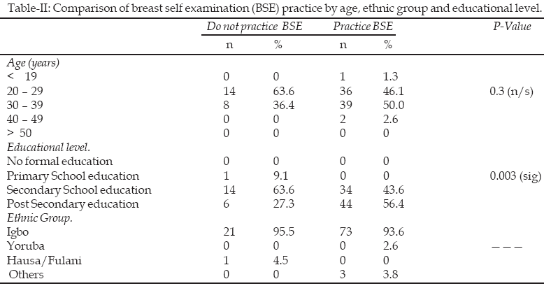 Whilst 78% of the respondents practiced BSE regularly, only 34% of them knew the reason for practicing breast self-examination. This means that the breast self-examination practiced was mostly ineffective. Only 3% of the respondents knew about a mammogram whilst none had had a mammogram done in the past. The vast majority (97%) of the respondents had heard of cancer of the breast. Breast self-examination was positively associated with educational level attained (Table-II).
