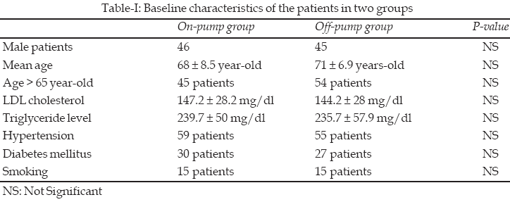Baseline characteristics were similar between patients in two groups (Table-I). Mean LDL level of on-pump and off-pump groups was 147.2 ± 28.2 mg/dl and 144.2 ± 28 mg/dl, and this difference was not statistically significant. Mean triglyceride level of on-pump and off-pump groups was 239.7 ± 50mg/dl and 235.7 ± 57.9mg/dl, which was not statistically significant.