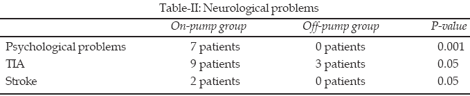 In case of serious neurological problems, in on-pump group 9 patients (15.3%) had TIA and two patients (3.4%) suffered from stroke. In off-pump group, three patients (5%) had TIA and no one suffered from stroke and this difference was statistically significant (P=0.05). (Table-II).