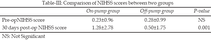 NIHSS pre-scores were 0.23±0.96 and 0.28±0.99 in on-pump and off-pump groups respectively. Post-scores were 1.28±2.78 and 0.50±1.75 in on-pump and off-pump groups respectively and this difference was statistically significant (Table-III). In other words, the results of our survey show that the prevalence of neurological complications, which is showed by NIHSS score, is more in on-pump cardiac surgery comparing to off-pump surgery.