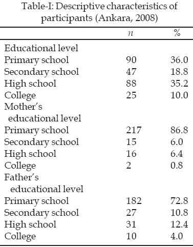 The number of the study group was 250. The mean age of the participants was 28.0 ±7.2 years. Primary school graduates and high school graduates were biggest groups (36.0%, 35.2% respectively). Most of the participants’ mothers and fathers were graduate from primary school (86.8%, 72.8% respectively, Table-I). Almost all of the participants were in low income group.