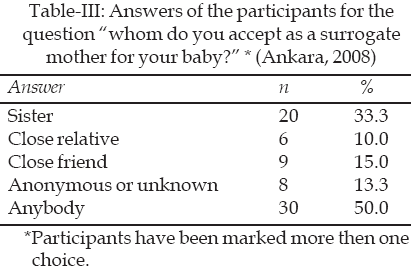 The number of the infertile females that stated they would never accept a surrogate mother was 190 (76.0%). Among the participants who stated positive response, 30 (50 %) females stated that identity of the surrogate mother was not important, 8 females (13.3%) stated that surrogate mother should be somebody whom they do not know, and 20 (33.3%) stated that they would only accept their sister as a surrogate mother (Table-III).