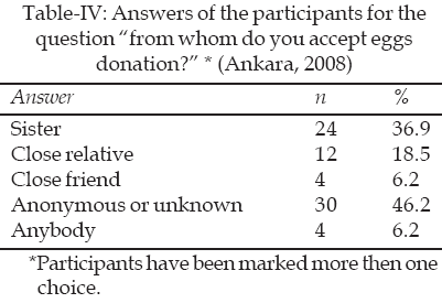 Of the participants 185 (74.0%) stated that they would never accept egg donation. Among the participants who stated positive response to accept egg donation from someone (n=65), "only from someone whom I do not know "was the most common answer (n=30, 46.2%) (Table-IV).
