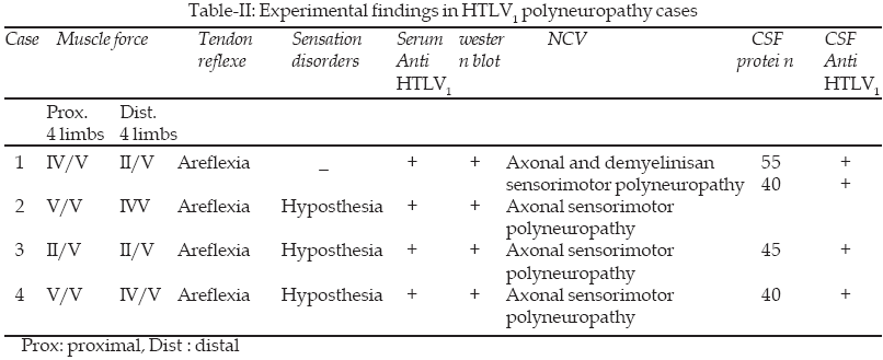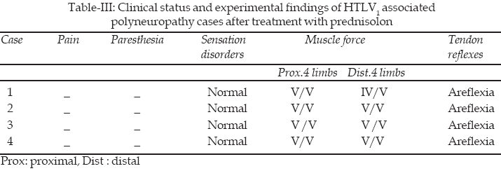 All of the HTLV-1 associated polyneuropathy patients were given prednisolone, 1mg/kg and tapering 5mg/ per week, for three month. This therapeutic regimen led to reduction of disease severity. Muscle force increased to V/V and paresthesia of all cases were severely decreased. The clinical data for the subjects are summarized in Table I,II & III.