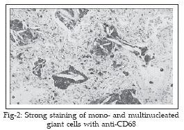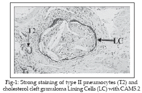 19 Currently there are no available data on cytokine elaboration by pulmonary cholesterol cleft granulomas.This immuno histochemical study confirmed that the intra-alveolar cell populations in NSIP were composed predominantly of CD68 positive cells. It showed that the giant cells were also CD68 positive, but were cytokeratin negative. In contrast, the cells lining the alveolar spaces containing granulomas were cytokeratin positive (AE1/AE3 and CAM5.2), indicating that these were type II pneumocytes and showing that these cells had completely replaced type I cells at these loci. In addition, it is known that macrophages and macrophage polykaryons have distinctive glycoprofiles and that pneumocytes types I and II can be distinguished by their profiles.