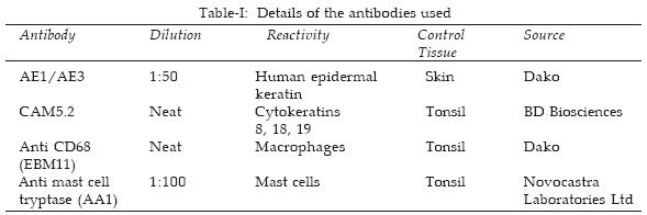 Nine formalin-fixed, paraffin-embedded blocks from six cases of Non-Specific Interstitial Pneumonia (NSIP) were obtained from the histopathology archive of the Wythenshawe Hospital Manchester. Paraffin-embedded sections (5µm), cut as near serially as possible, were dewaxed, blocked for endogenous peroxidase, rehydrated and immunostained with the monoclonal antibodies AE1/AE3, CAM5.2, anti-CD68 and anti-mast cell tryptase as detailed in Table-I. Sections were pre-treated with 0.03% (w/v) trypsin (type II, porcine, Sigma) stained directly with anti-CD68 and indirectly with AE1/AE3, CAM5.2 and anti-tryptase using the avidin-biotin method