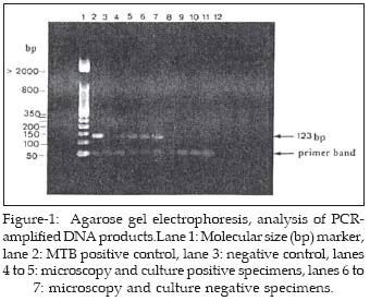 oC in lysis buffer containing proteinase K. DNA was extracted by using standard extraction kit (Cinnagen Co., Tehran, Iran) according to manufacturer’s instructions. As a negative extraction control, negative samples were processed in exactly the same manner as the positive controls and test samples. PCR amplification was performed using assay based on a repetitive sequence IS 6110 of MTB7 and by application of two oligonucleotide primers IS1 and IS2 as 5´- CCTGCGAGCGTAGGCGTCGG and 5´- CTCGTCCAGCGCCGCTTCGG for the detection of a 123-bp DNA fragment.8The reaction volume (25µl) composed of 50 mmol KCl, 10mmol Tris-HCl (pH 8.3), 1.5 mmol MgCl
