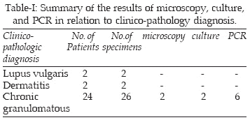 PCR gave positive results in 6 out of 8 specimens taken from patients with chronic granulomatosis. None of the specimens from patients diagnosed clinico-pathologically as lupus vulgaris or dermatitis were positive by direct microscopy, culture or PCR. PCR positive cases included two previously mentioned specimens with positive microscopy and culture (Figure-1).