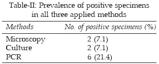 Of the PCR-positive cases, 5 belonged to male patients (23.8%) and one specimen was from a female patient (14.3%). A summary of the results is shown in Table-I. Based on the results obtained, 7.1% of the specimens were positive in both direct microscopy and culture. Using PCR technique, 21.4% of the total specimens tested, were positive for the presence of M. tuberculosis DNA (Table-II), while the difference between applied methods was significant (P<0.0016).