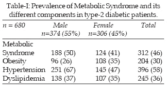 The prevalence of Metabolic Syndrome and its complications in cardiovascular system were noted in patients of Diabetes Mellitus type-2. A total of 680 patients were screened and diagnosed with Diabetes Mellitus type-2. Their mean age was calculated as 58 years. The mean duration of Diabetes Mellitus was 13 years. Out of these 680 patients, 312 were found to be of Metabolic Syndrome. In these 312 (46%) patients 188 (50%) were males and 124 (41%) were females. Male-female ratio was 50:41 proving that the disease was more dominant in males.