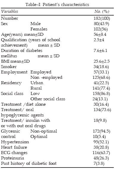 The total number of patients was 182 (80 males and 102 females), with mean age of 56±8.4 year, and qualification of 2.5±4 year (Table-I). Duration of DM was 7.6±6.1 year and BMI of 25.6±2.5. Sixty eight point six percent were non-employed and 77.4% were from rural area. Most of them were from low social class (86.8%). Their treatment were diet with oral hypoglycemic drugs in 73.6% and most of them were having non-optimal glycemic control (94.5%) according to ADA. Hypertension was present in 52.1% with heart failure in 20.8%, ECG changes in 63.7% and proteinuria in 26.3%.