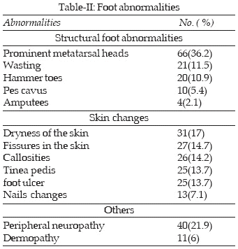 Structural foot abnormalities reported in diabetic patients were prominent metatarsal heads in 36.2%, wasting in 11.5% hammer toes in 10.9%, pes cavus in 5.4%, claw toes in 3.8%, and amputees in 2.1% (Table-II). While skin changes includes dryness of the skin in 17%, fissures in the skin in 14.7%, callosities in 14.2%, Tinea pedis in 13.7%, foot ulcer in 13.7% and nails changes in 7.1%. Peripheral neuropathy and dermopathy were seen in 21.9% and 6% respectively.