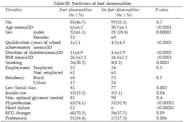 Diabetic foot abnormalities were reported in 46.7% of patients (Table-III). Most of the patients were having more than one abnormality. Varabiles predicts foot abnormalities ,that are statistically significant were higher age, male sex, less school achievement, longer duration of DM, higher BMI, smoking history, low social class, insulin use, hypertesnion, heart failure and proteinuria.