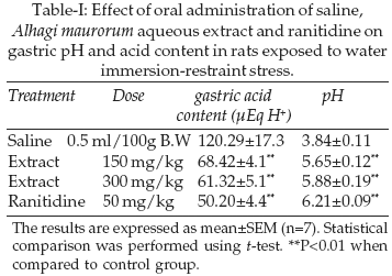In water immersion restraint-induced ulcerated rats, the gastric acid content was lower and pH was higher (P<0.01) in animals pretreated with AME as compared to control rats (Table-I). On gross examination, all animals given AME at 1, 2, 4, 6, 8, and 10g/kg (p.o.) did not show any toxic symptoms and mortality up to 48 h after AME administration.