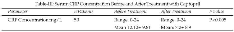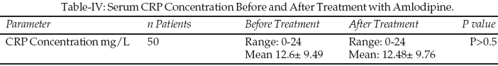 A significant reduction of serum CRP level was demonstrated after treatment with captopril (P<0.005) (Table-III). No significant reduction of CRP was demonstrated after therapy with amlodipine (Table-IV).