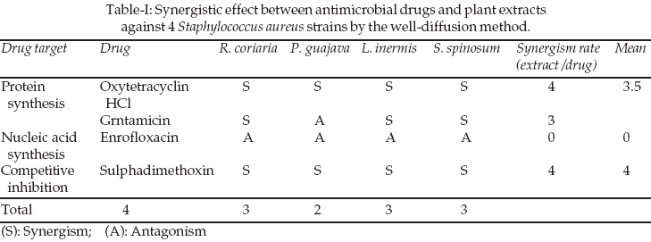 Antimicrobial mechanisms of the drugs used here were variable and the nucleic acid synthesis inhibitor did not show synergistic effect. However, competitive inhibitor (sulfadimethoxine as sodium) and protein synthesis inhibitors (oxytetracycline HCl, gentamicin sulphate) showed strongest synergistic interaction. The data pertaining to the antimicrobial potential of the plant extracts and antibacterial drug combination against S. aureus using well diffusion method are presented in Table-I.