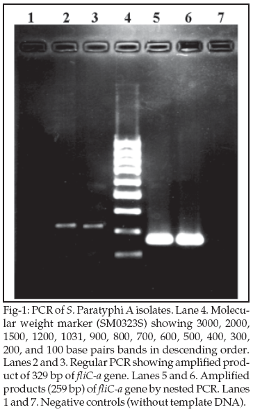 Methodology: S. Paratyphi A isolates were used for regular PCR targeting specific region of fliC-a gene. New primers were designed and conditions were optimized for a nested PCR that could be directly applicable on blood samples. The procedure was tested on 70 blood samples from suspected cases of typhoidal infection and comparison made with blood culture.