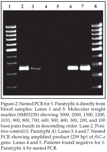 Results: Blood culture was able to diagnose only four patients as infected with S. Paratyphi A. Regular PCR was unable to detect S. Paratyphi A directly from blood where as nested PCR detected S. Paratyphi A in blood of thirteen patients.
