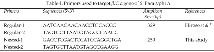 13 whereas DNAs from 200µl of each of blood samples were extracted by genomic DNA extraction kit K0512 (Fermentas, USA). The integrity of extracted DNAs was checked by 1% agarose gel electrophoresis. For regular PCR, primers targeting specific region of fliC-a gene of S. Paratyphi A were used, 11 whereas primers for second round (nested) PCR were designed from the nucleotide sequence database (Genbank [X03393]). Both primer sets were supplied by Sigma (Dorset, United Kingdom) and the sequences are shown in Table-I.