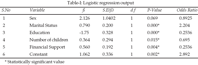 Data was analyzed on SPSS for windows (ver 12.00) and Student T test was applied to test the correlation among different variables. The multiple logistic regression model was used to determine the predictive strength of depression with nominal variables (sex, marital status, education, number of children, financial support). The overall model was tested by using Chi Square statistic.RESULTS
