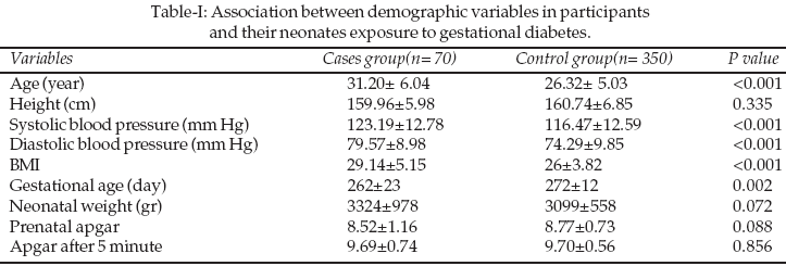From 420 pregnant women that were selected for this study, 350 persons (83.3%) were non diabetic and 70(16.7%) of them were diabetic that acquired the disease during pregnancy and developed gestational diabetes. Twenty eight (.08%) of participants had history of gestational diabetes while Twenty women (72.4%) developed gestational diabetes during current pregnancy. Mothers in exposed group (cases) showed significant difference by age, systolic and diastolic blood pressure, BMI and gestational age variables with non-exposed group (P<0.05). However, there wasn’t any difference considering the height between two groups (P>0.05).