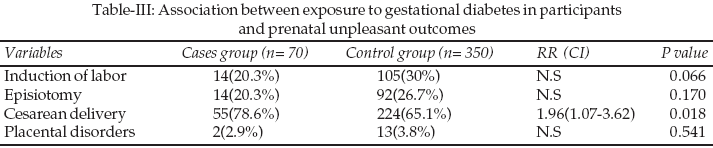 This study looked at the association between gestational diabetes with some prenatal outcomes in participants. It showed that mothers with gestational diabetes completed their pregnancy with cesarean delivery in comparison with non diabetic mothers (RR =1.96), (P<0.05). However, it did not show significant difference in induction of labor, episiotomy and placenta disorders (P>0.05). (Table-III)