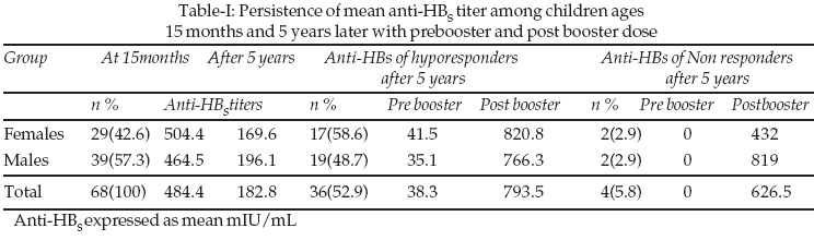 Results: Mean anti-HBs titers in 68 children (29 females, 39 males) were 482.1mIU/mL at six months after the third dose of primary vaccination and 153mIU/mL at five years later. Total mean anti-HBs titers in 36 (52.9%) children out of 68 (17 females, 19 males) were 38.3mIU/ml and 4(5.8%) of 68 children (two of each sexes) had no detectable antibody after five years. Total mean anti-HBs titers in these hypo- responder and non- responder were 774.3mIU/mL and 625.5mIU/mL respectively after booster dose.