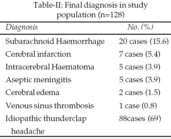 A total of more than 87,000 patients attended the Casualty department during the study period. Among these; 22,543 patients had different Medical problems. Out of them 128 cases which is less than 1%, had acute severe thunderclap headache, fulfilling the study criteria and were included in the study. Age range was 15 to 80 years with mean age of 46 ±10 years. Seventy eight (78) cases (61%) were female and 50 cases (39%) were male. The in-hospital follow up period was from two to 14 days. (Mean 7±2). Post discharge review visit was four weeks later. Age distribution of patients is shown in Table-I and final diagnosis made in all cases is shown in Table-II. Past history of not more than three similar episodes was present in 33 cases (25.78%). Out of these 33 cases, 30 (91%) belonged to the benign group of 88 while three cases (9%) had organic causes. All three had similar less severe episodes only once within previous three months.