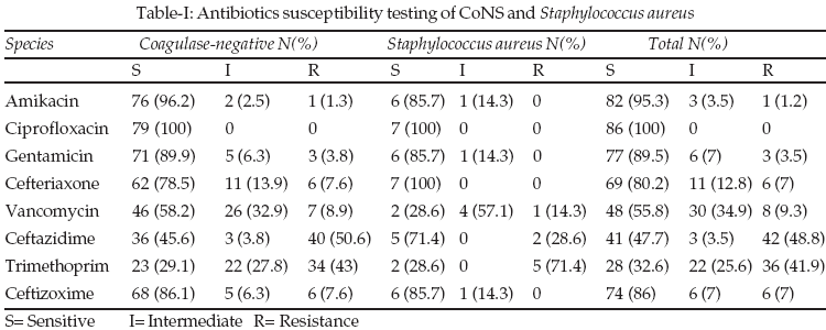 The most frequently isolated bacterium was the coagulase-negative Staphylococcus (CNS), found in 79 eyes (88.8%). Staphylococcus aureus was isolated from 7 eyes (7.9%), proteus spp. from two eyes (2.2%) and Citrobacter freundii from 1 eye (1.1%). In this study 82 cases (95.3%) of isolated Staphylococcus were sensitive to Amikacin, 86 (100%) sensitive to Ciprofloxacin and 41 (47.7%) sensitive to Ceftazidime. (Table-I)