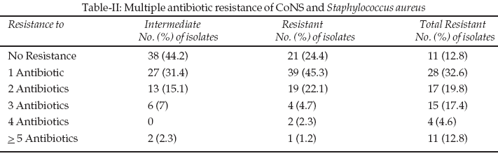 Eleven isolates (12.4%) were sensitive to all antibiotics. Twenty three (25.8%) did not show any resistance to antibiotics. Among the isolated Staphylococcus colonies for which antibiotic susceptibility tests were carried out, 7 cases (8.1%) showed resistance to several antibiotics (three or more), and 30 cases (34.9%) were resistant or intermediate susceptible to several antibiotics (Table-II). One of the isolated proteus was resistant to trimethoprim and intermediate susceptible to Vancomycin. The isolated Citrobacter freundii was susceptible to all of antibiotics. The mean of susceptibility and resistancy to antibiotics was 2.6 (±1.8) in women and 1.6(±1.4) in men (F: 7.115, df: 1, p: 0.009)