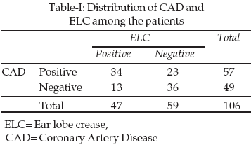 The study population consisted of 70 men and 36 women whose mean age was 50.14±14.11 years. Patients who had coronary artery disease (CAD+) consisted of 57 subjects in whom 34 persons had earlobe crease (mild to severe ELC) and 23 patients did not have ELC (no ELC).