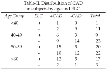 Gold standard test of CAD was coronary angiogram which was performed in all participants. CAD was defined as the presence of angiographic coronary stenosis >50% of the luminal diameter in at least one of the three major epicardial arteries. The coronary cineangiograms were analyzed by experienced cardiologists unaware of the presence of the ELC. Statistical Analysis was performed using Chi-square, Cochran and Mantel- Hanzel tests with SPSS software Version 11.