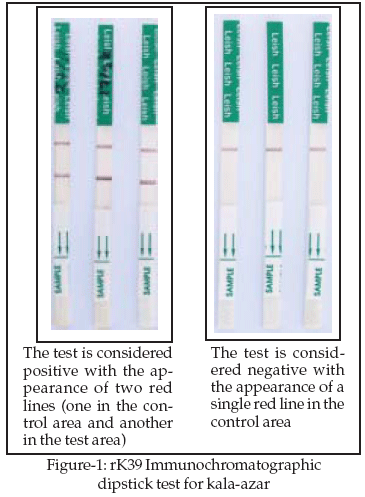 Finally, the ICT results of present study and similar studies carried out in neighboring countries have encouraged us to recommend this highly sensitive, non-invasive, rapid, easy to perform, low-cost diagnostic test to be used anonymously in the field for the serodiagnosis of kala-azar. In fact, WHO in its South East Asia regional meeting for the prevention and control of Dengue, Japanese Encephalitis and Kala-azar, has recommended Immunochroma-tographic dipstick test to be used for screening people at risk in the endemic areas of this region.