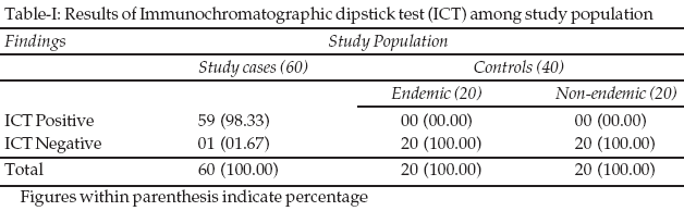 We have performed rK39 Immunochro-matographic dipstick test (ICT) for all of our study population. There were fifty nine (98.33%) ICT-positive cases out of sixty clinically suspected VL cases. On the contrary, ICT was found negative among all endemic and non-endemic controls (Table-I). All smear-positive cases (confirmed cases of kala-azar) were also found positive for ICT indicates its sensitivity to be 100%. There have been many studies carried out on ICT in the recent years and the results of the present study are very much consistent with majority of those studies.