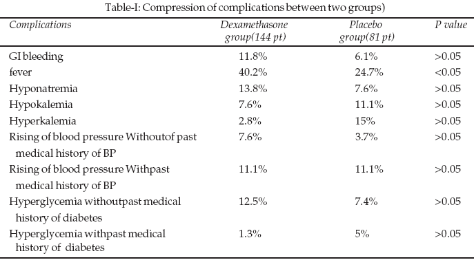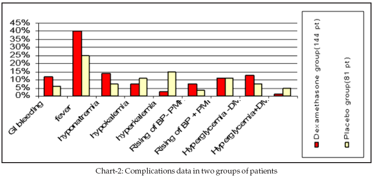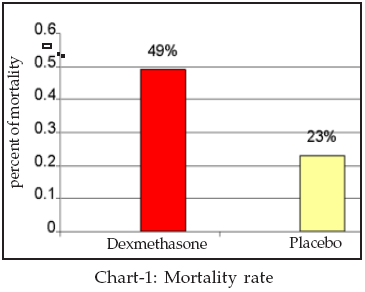 Mortality was much higher in the dexamethasone group; Dexamethasone group (49.3%) and placebo (23.4%) so there was a significant difference between them. (P<0.05) (Chart-1) and also fever was higher seen in the dexamethasone group; dexamethasone group (40.2%) and placebo group (24.7%) so there was a significant difference between two groups (P<0.05) but there was no significant statistical difference between two groups as regards other complications. (Chart-2 & Table-I)