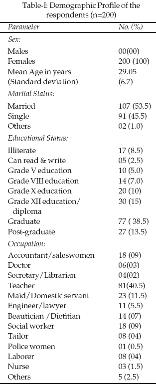 Two hundred working women were interviewed. The mean age was 29.05 years. A majority was married (53.5%) with more than grade XII education (67%) and in teaching profession (40.5%) [Table-I]. Sixty three (31.5%) women were working due to need and eighty three (41.5%) were finding it difficult to carry out home responsibilities because of it. Extra understanding and support was received from family by 155 (77.5%) and 115 (57.5%) women respectively.